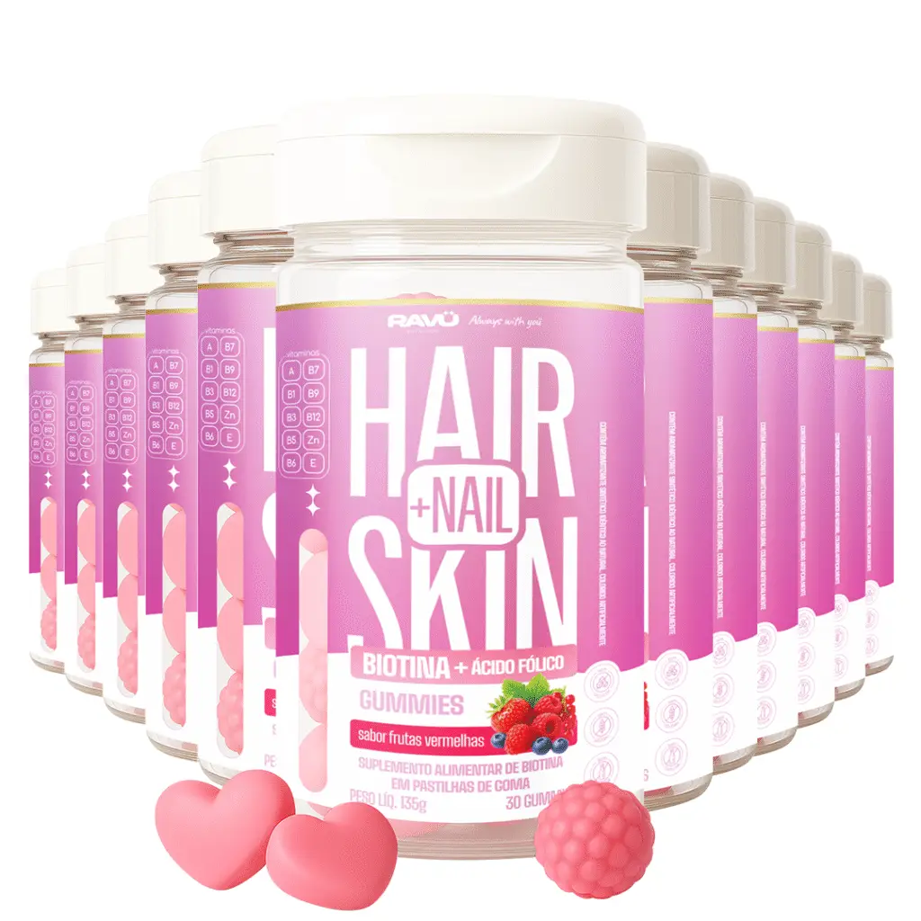 O Hair + Nail Skin® Gummies foi criado especialmente para a mulher moderna que deseja cuidar da beleza de dentro pra fora. Com uma fórmula rica em Biotina, Ácido Fólico e Ácido Pantotênico, ele atua diretamente na saúde dos cabelos, unhas e da pele, promovendo uma aparência mais saudável, jovem e vibrante.
