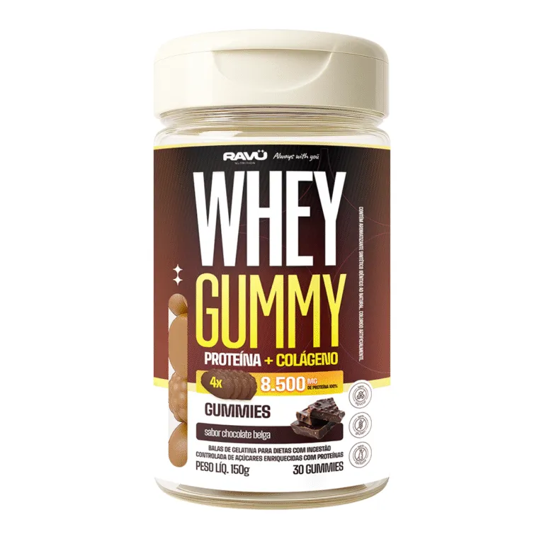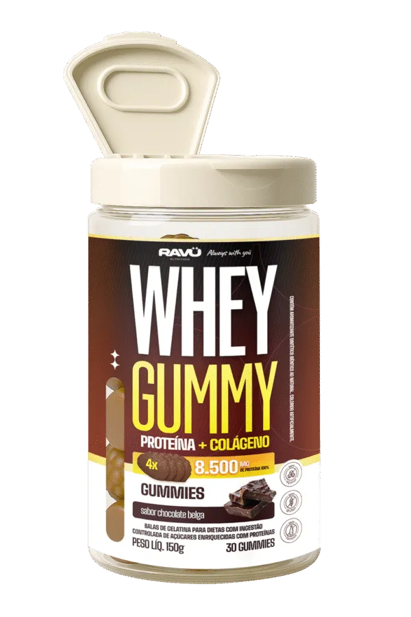 Whey Gummy® é proteína de alta qualidade em formato de goma. São 8g de proteína por porção, com whey isolado + colágeno, zero açúcar, zero lactose e sabor chocolate belga. Nutrição prática, deliciosa e eficiente para sua rotina.
